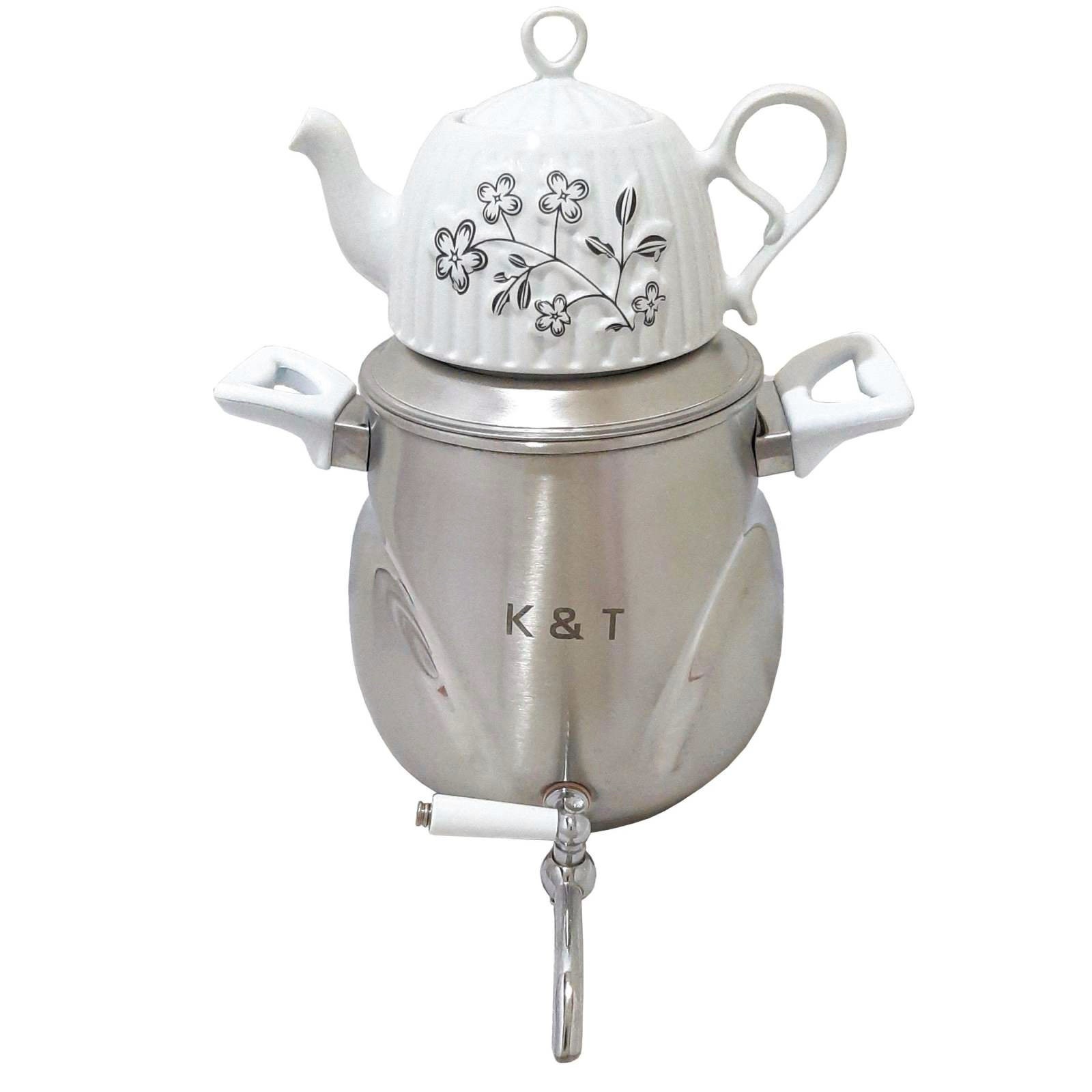 ست کتری و قوری کی اند تی جدید از بهترین برندهای کتری و قوری است.کفه ی ضخیم دایکاست که در این کتری به کار رفته باعث میشود حرارت به طور یکنواخت در کل کفه تقسیم شود و از سوختن کتری جلوگیری کند.شیر بلند این امکان را میدهد که بر روی هر اجاقی قابل استفاده شود.درپوش فنری و دسته های باکالیت از دیگر مزایای آن است. طراحی بسیار زیبا در کنار کیفیت بالا شاخصه ی کتری های کی اند تی است که آن را باب میل سخت پسندان میکند.